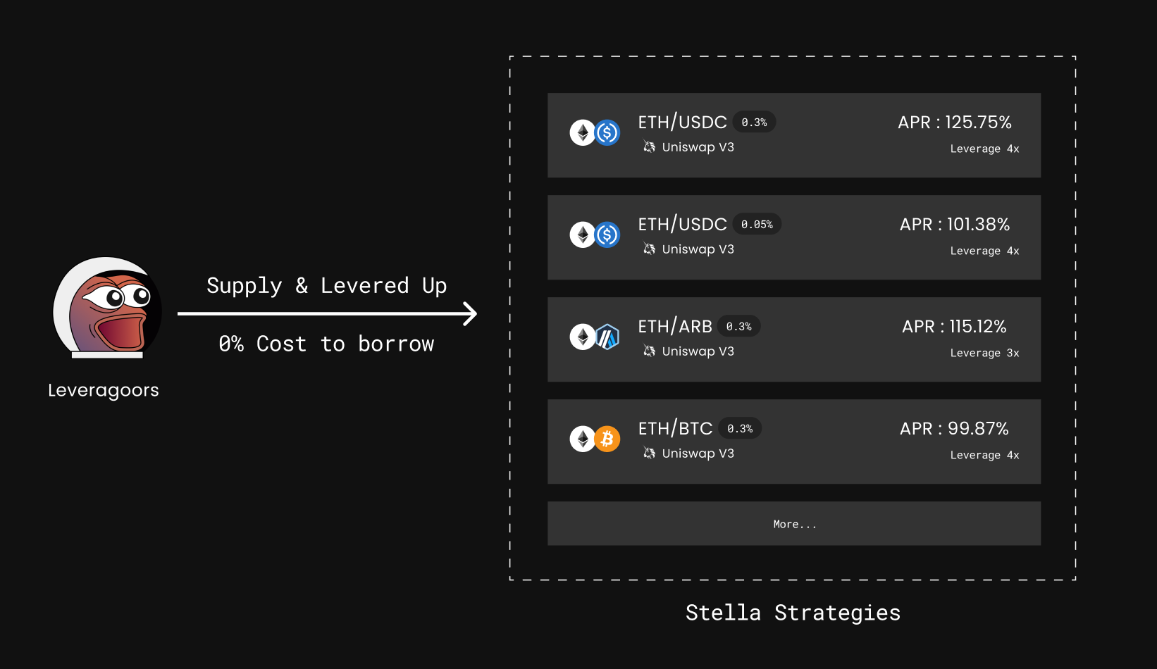 Stella strives to serve as the gateway for users to access a wide range of leveraged strategies by prioritizing quick responsiveness to meet the evolving needs of users, especially in the DeFi world. With varying levels of knowledge and backgrounds, users will find a leveraged strategy in DeFi that aligns with their individual approaches.